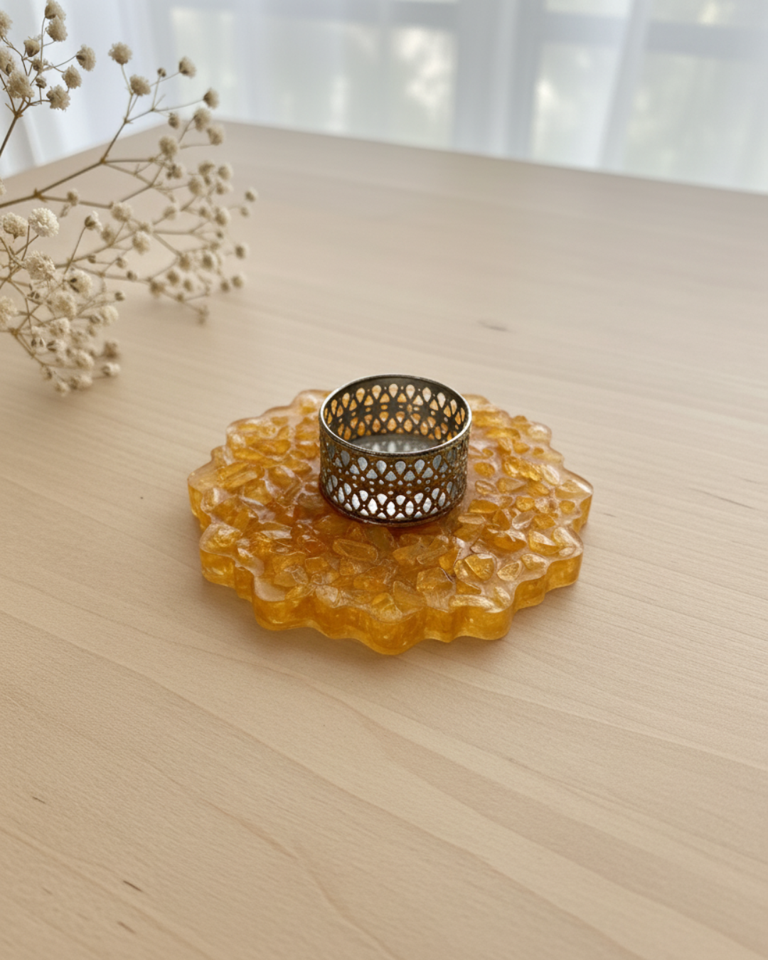 Bring light and abundance into your space with the Citrine Crystal Tealight Holder ✨. Known as the “Merchant’s Stone,” citrine attracts opportunities, joy, and success while dispelling negative energy. The handcrafted resin base, infused with golden citrine chips, amplifies your manifesting intentions as the candlelight glows.